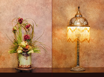 These designer silk floral arrangements perfectly complement our color washed furniture pieces – just take a look below! And the Moroccan fringe and metal lamp is so enticing, adding warmth and romance to any space.