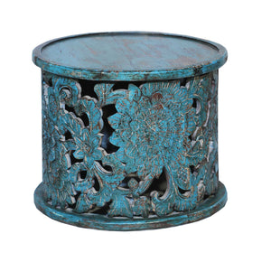 Farmhouse Style Hand Carved Lattice Distressed Blue Round Side Table