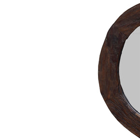 Teak wood wheel salvaged from an old ox cart has been upcycled into this rustic, country-style mirror.