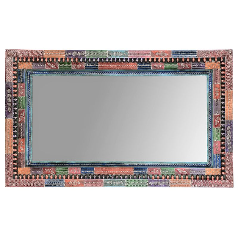 Brilliantly decorated with ornate hand-painted designs decorating every inch of this dramatic mirror. Painted spindles adorn the mirror frame giving it a three-dimensional look. Vibrant colors of this mirror make it a perfect addition to any living room or hallway.