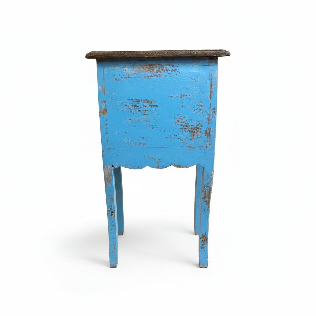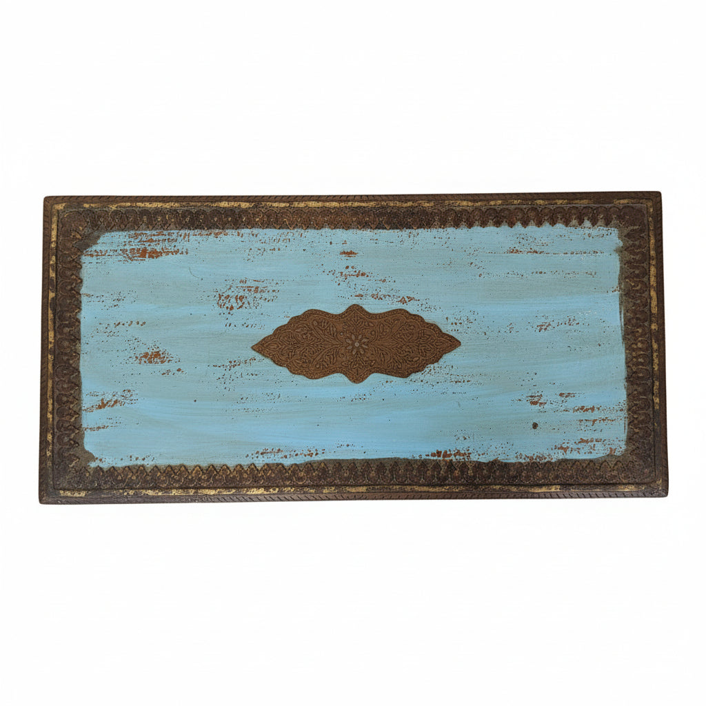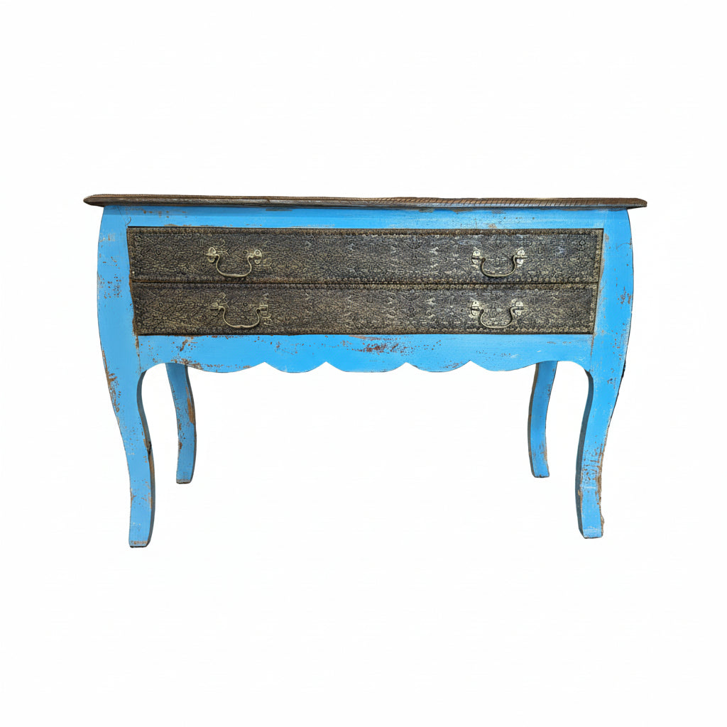 Distressed Blue Wooden Console Accented With Hand Hammered Brass Foil