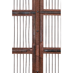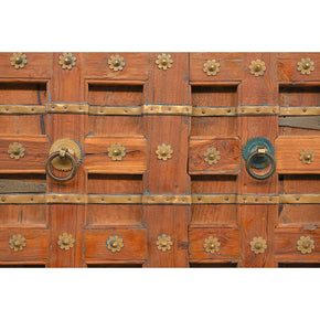1900s Vintage Teak Wood Door With Original Brass Straps And Decorative Flower Pins