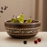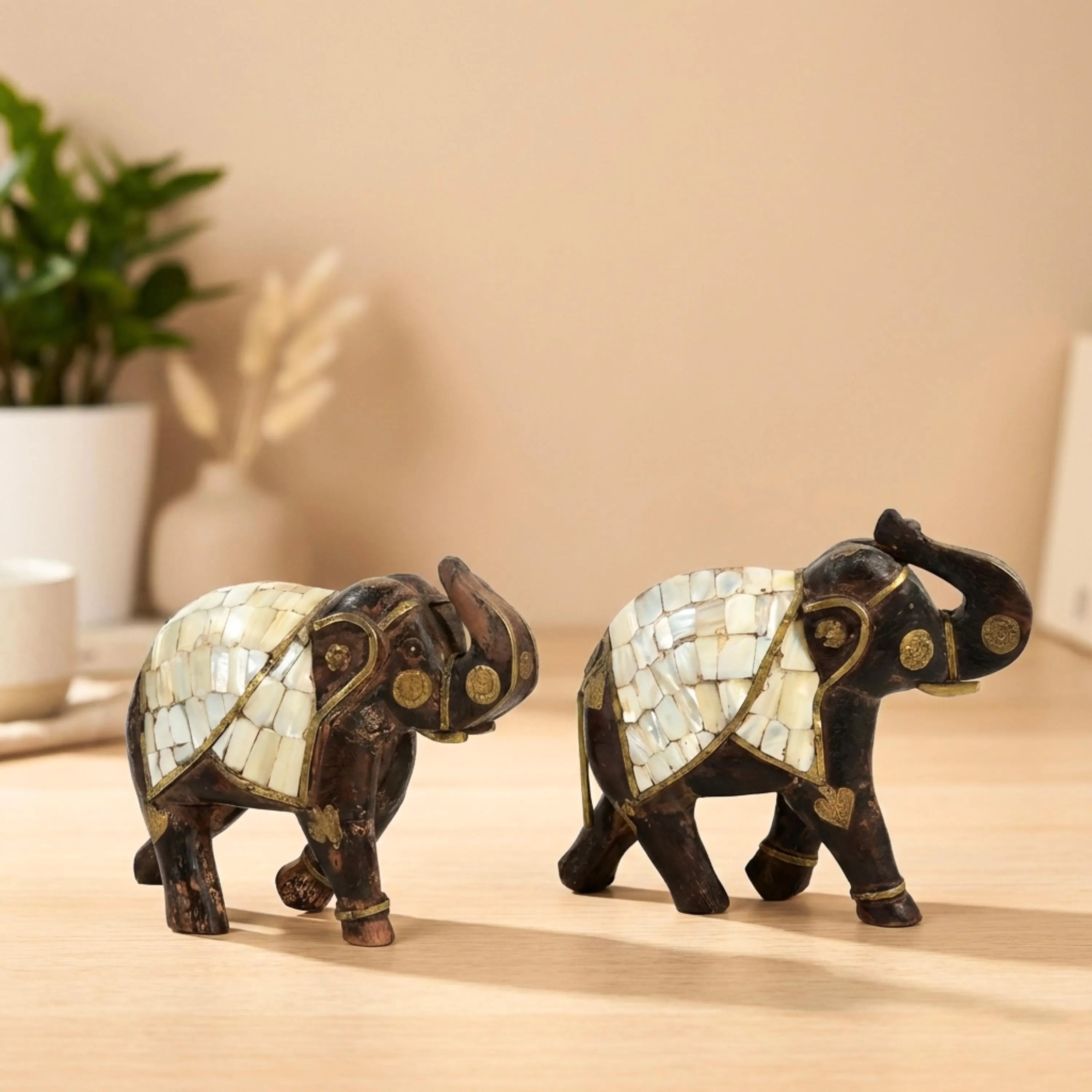 This is a vinatge elephant statue featuring bone overlay and brass foil. Hailing from India, it represents the rich history of the kings when the elephants were the royal ride.
