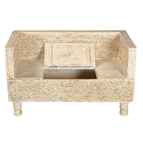 Elegantly Hand Carved Wooden Storage Bench Seat In Distressed White