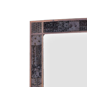 Salvaged hand carved fabric stamps have been thoughtfully designed and inset in a solid wood frame to craft this unique mirror.