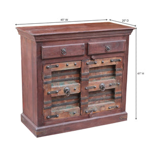 Far Pavilion takes pride in offering you the best and the most premium quality sideboards and credenzas. Our storage cabinets are available in a variety of one-of-a-kind styles and designs. They are crafted from solid wood and reclaimed wood that has been sourced from timber with a rich history. Old architectural elements like antique doors, columns, windows are upcycled and given a new life by repurposing them into furniture pieces. It is our best effort to keep the original nail heads, brass pins, metal pulls, and other hardware intact to enhance the beauty of these sideboards.