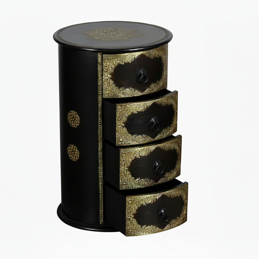 This beautiful solid wood cylinder chest of drawers softens the more traditional lines of a drawer unit. It is beautifully ornamented with hand-embossed brass foil.