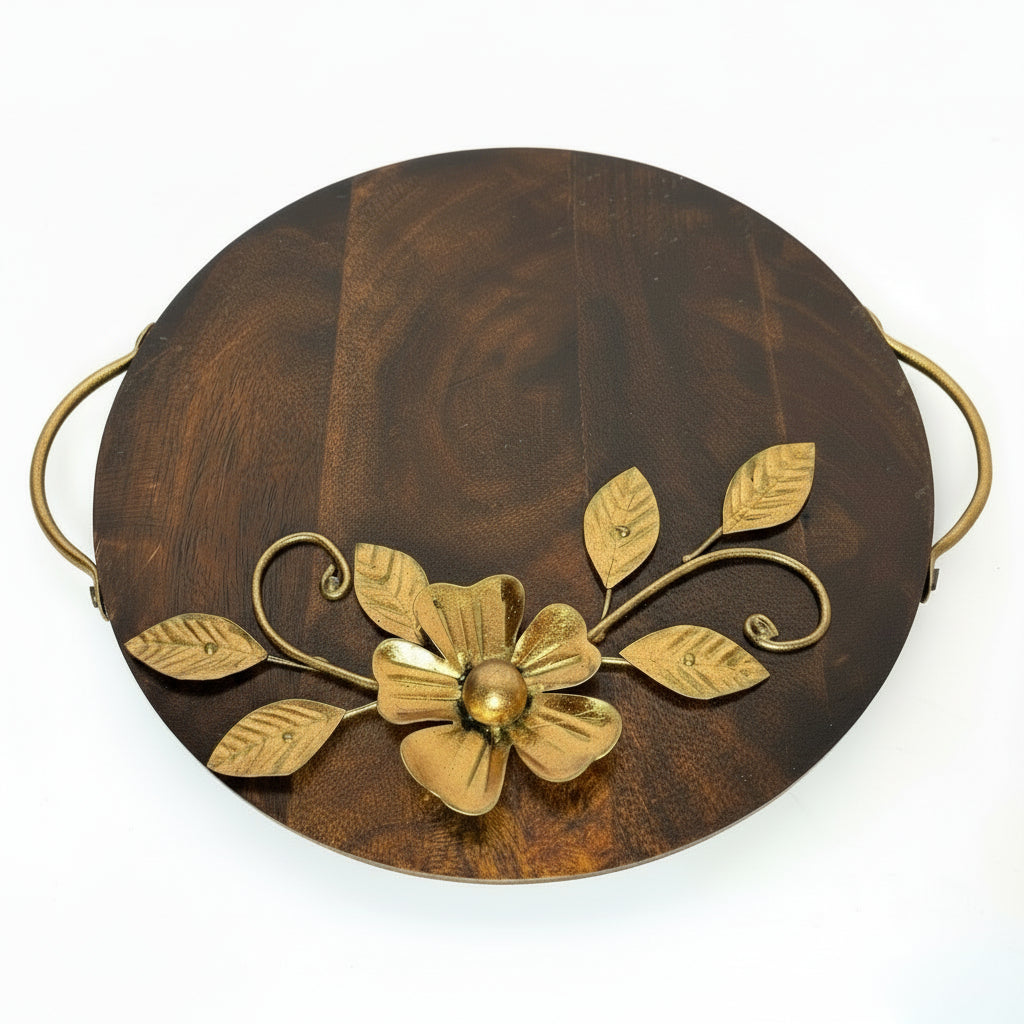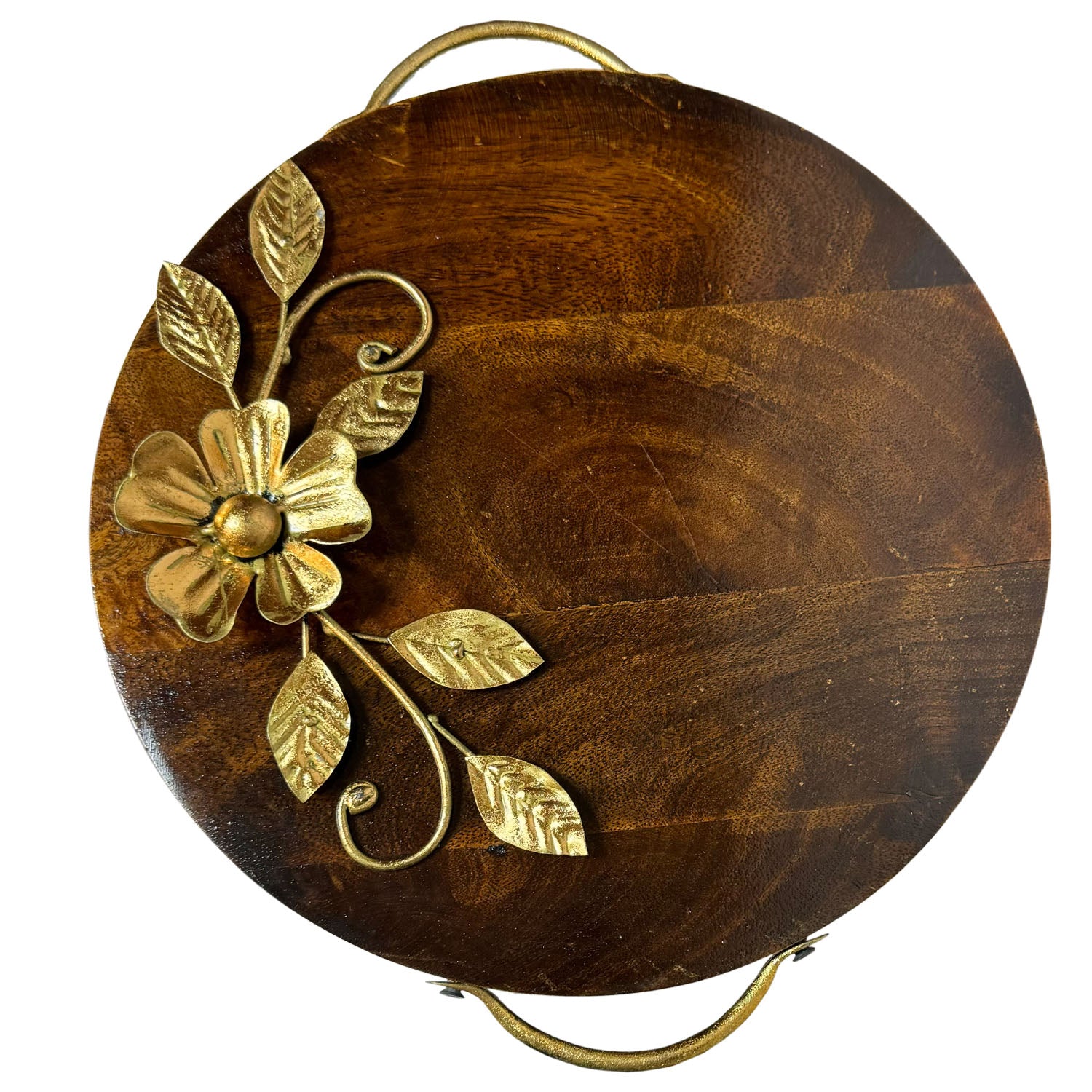 Artistic 12 in. Round Wooden Tray With Metal Floral Accent