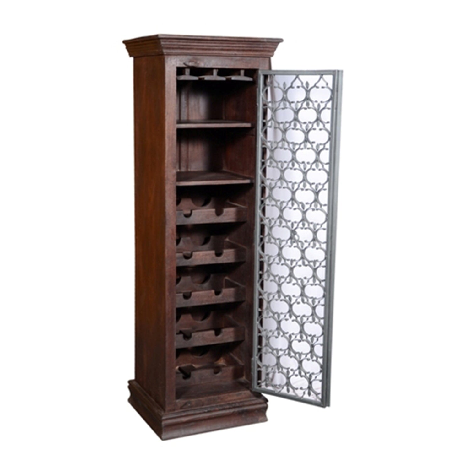 This unique cabinet can serve as a mini bar. Crafted from solid wood it contains shelves that can hold 10 wine bottles and sliders for stemware. The metal door finished in distressed chrome adds to the desired look.