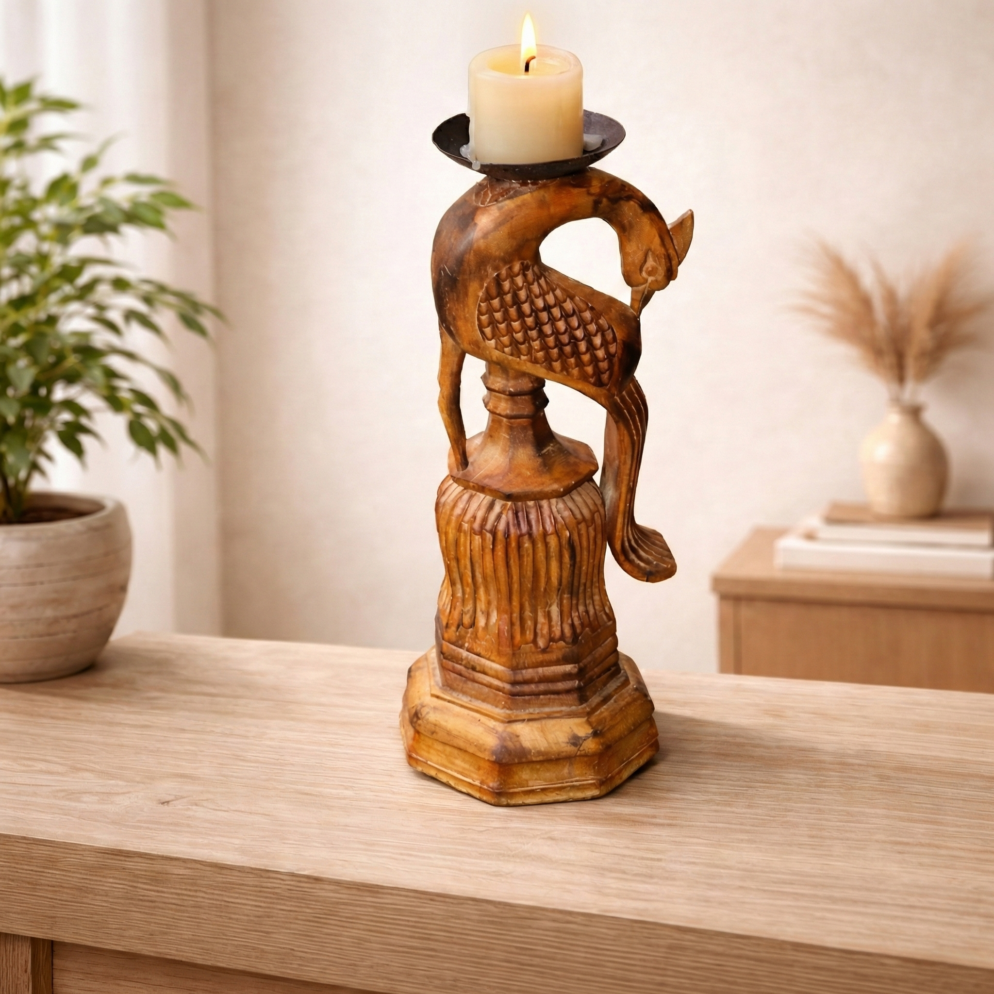 • Late 1900s vintage carved peacock bed post repurposed